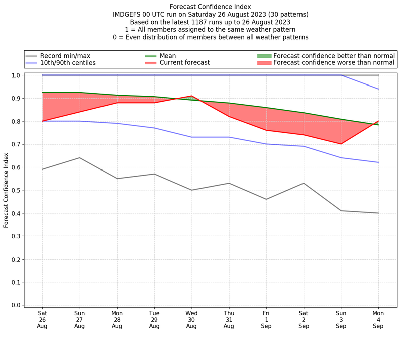 | Weather patterns typically associated with contrywide dry period tendencies over India are most likely Weather patterns 2, 3, 7, 8, 9, 16 and 20 (countrywide winter dry period) | |