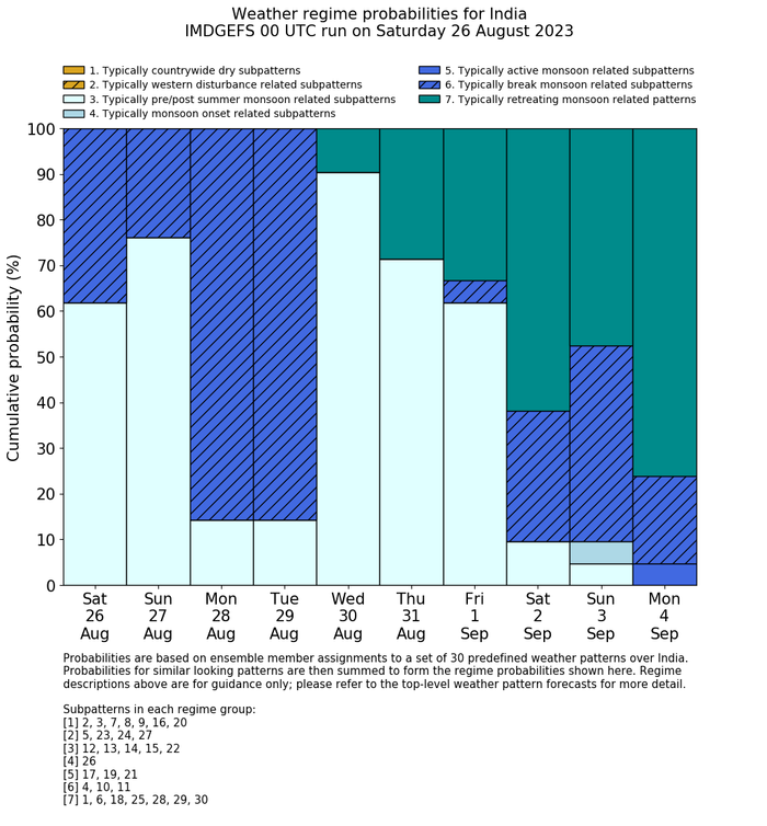 | Weather patterns typically associated with break monsoon tendencies over India are most likely Weather patterns 4, 10 and 11 (break) | |