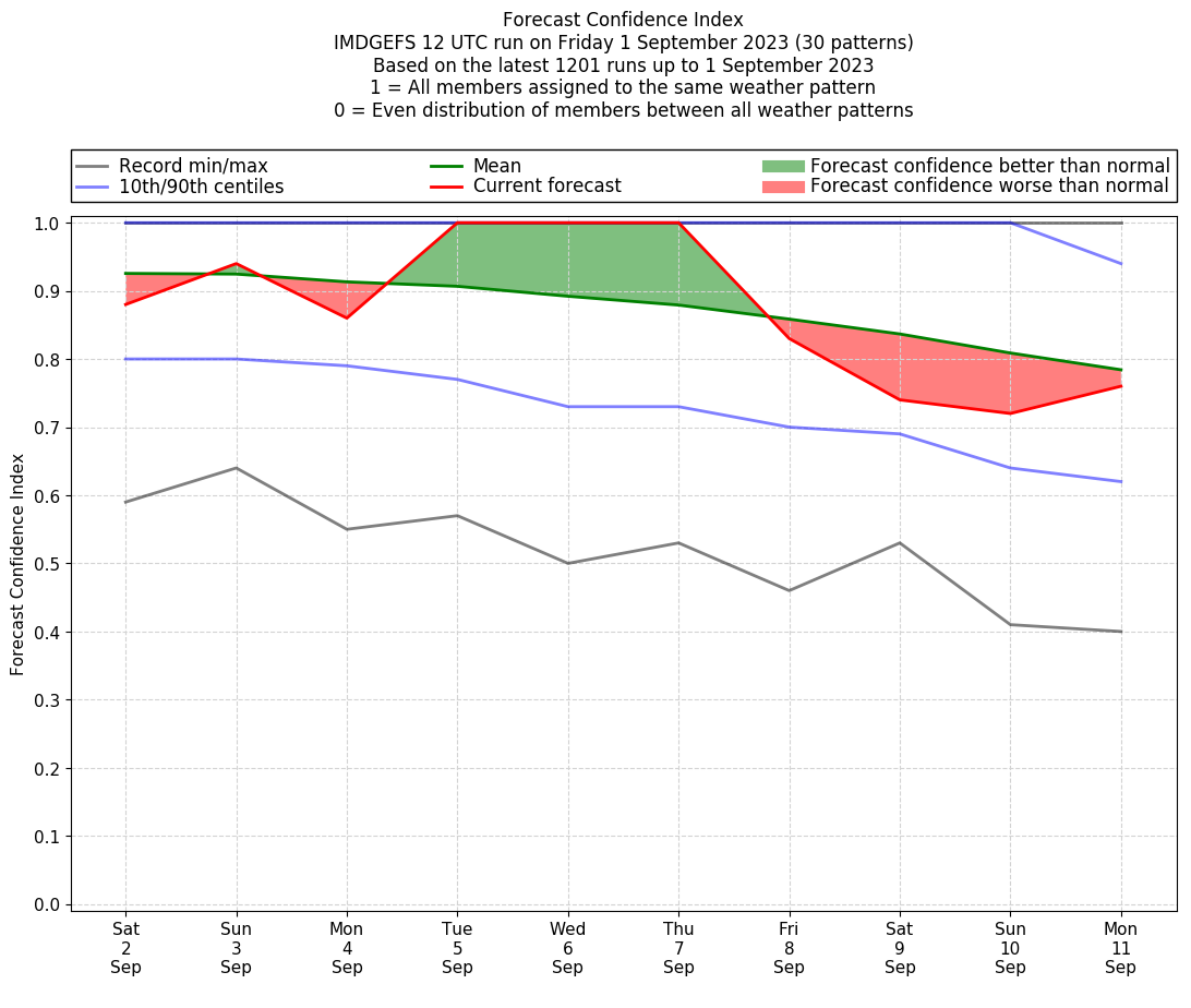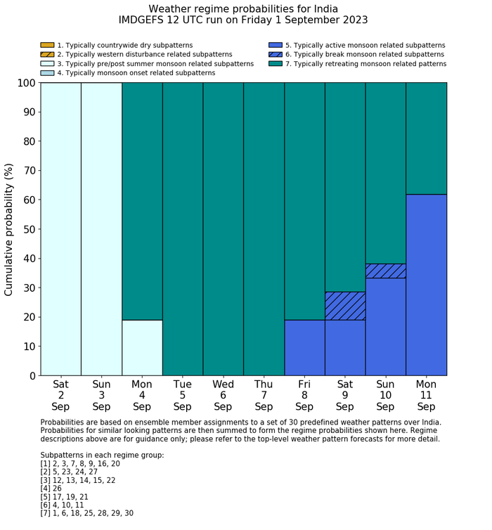 | Weather patterns typically associated with contrywide dry period tendencies over India are most likely Weather patterns 2, 3, 7, 8, 9, 16 and 20 (countrywide winter dry period) | |