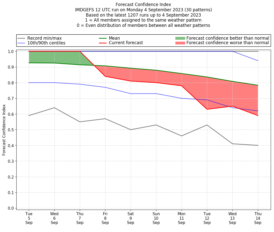 | Weather patterns typically associated with contrywide dry period tendencies over India are most likely Weather patterns 2, 3, 7, 8, 9, 16 and 20 (countrywide winter dry period) | |