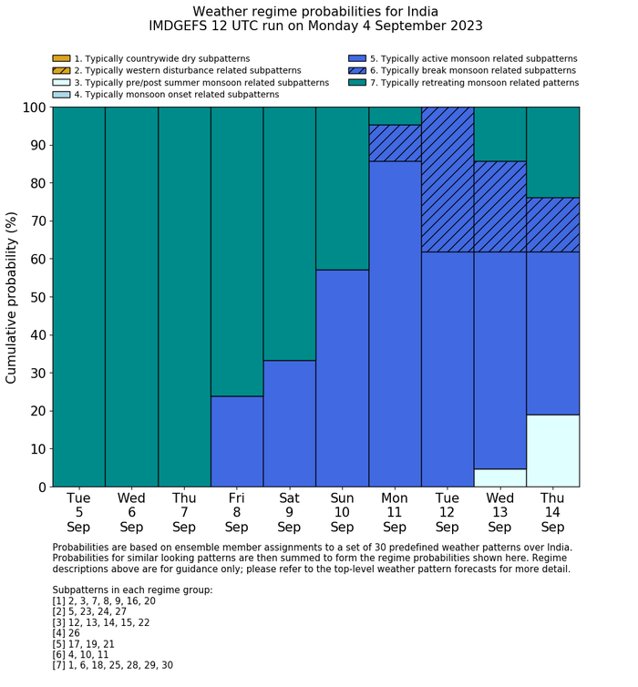 | Weather patterns typically associated with break monsoon tendencies over India are most likely Weather patterns 4, 10 and 11 (break) | |