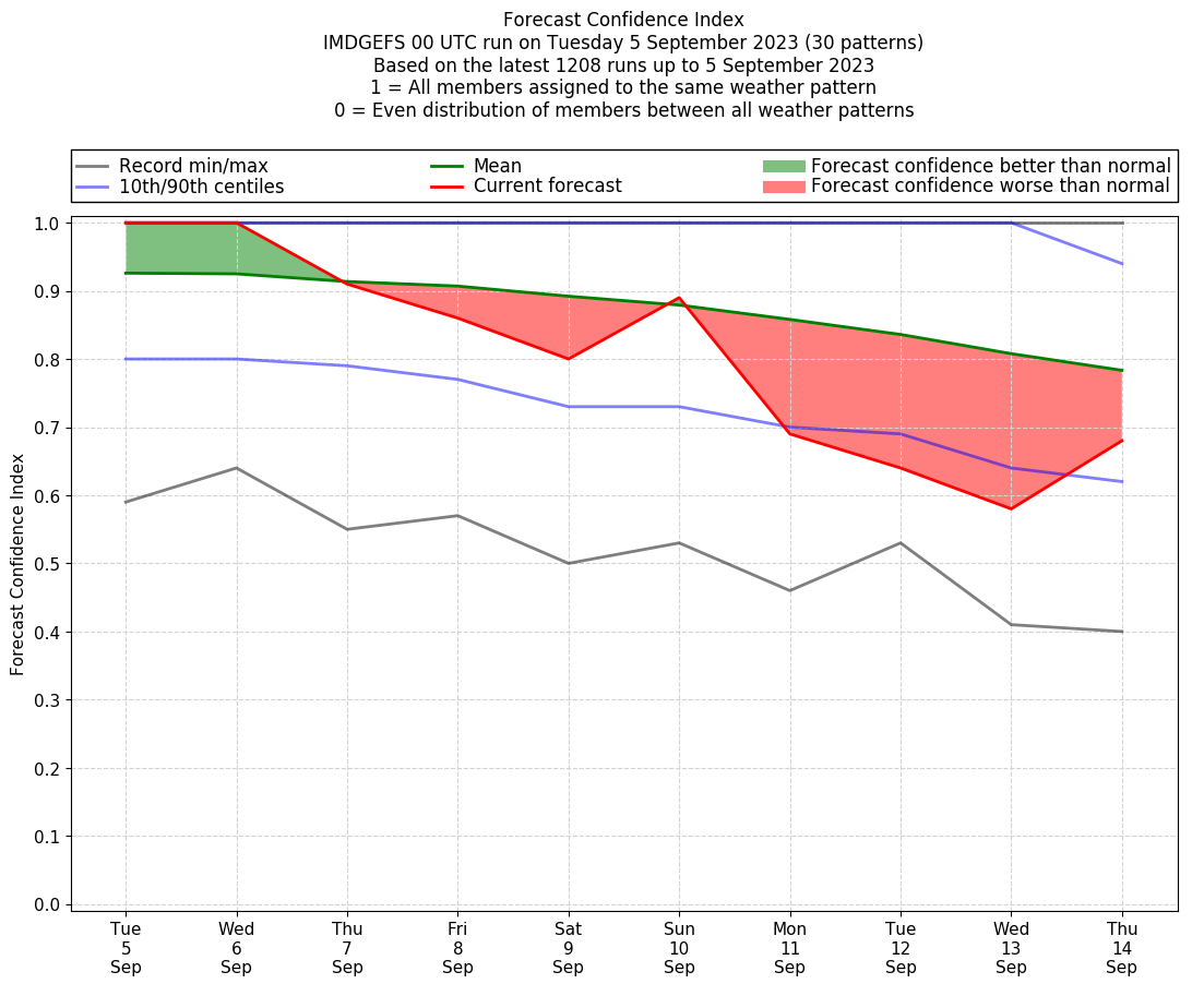 | Weather patterns typically associated with contrywide dry period tendencies over India are most likely Weather patterns 2, 3, 7, 8, 9, 16 and 20 (countrywide winter dry period) | |