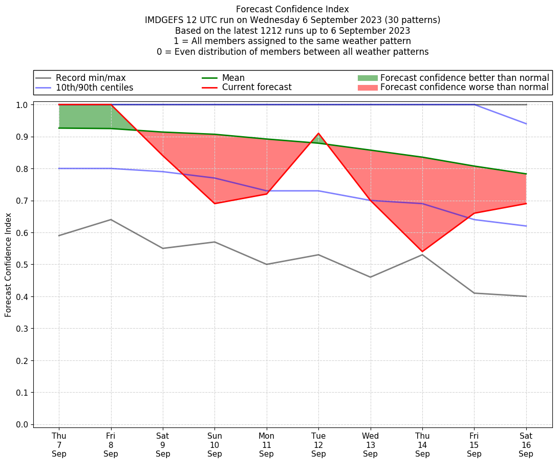 | Weather patterns typically associated with contrywide dry period tendencies over India are most likely Weather patterns 2, 3, 7, 8, 9, 16 and 20 (countrywide winter dry period) | |