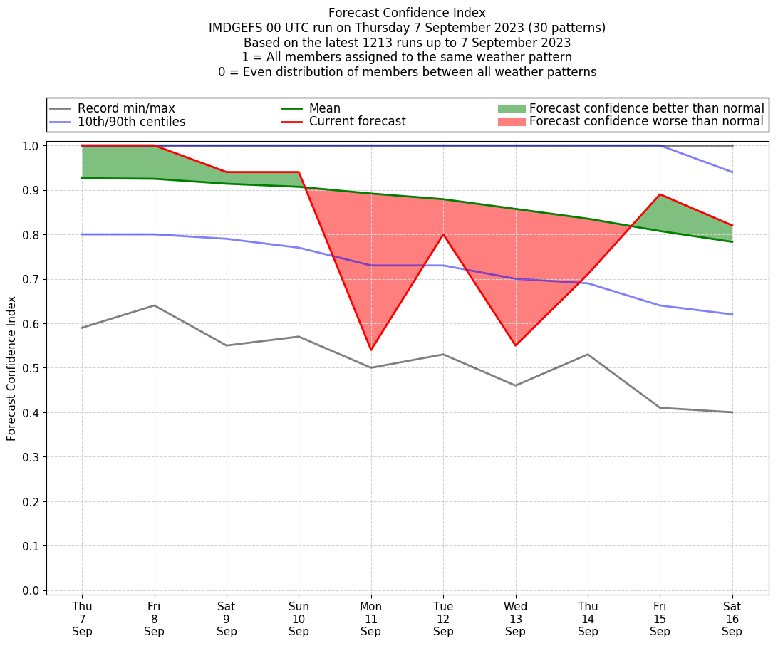 | Weather patterns typically associated with contrywide dry period tendencies over India are most likely Weather patterns 2, 3, 7, 8, 9, 16 and 20 (countrywide winter dry period) | |