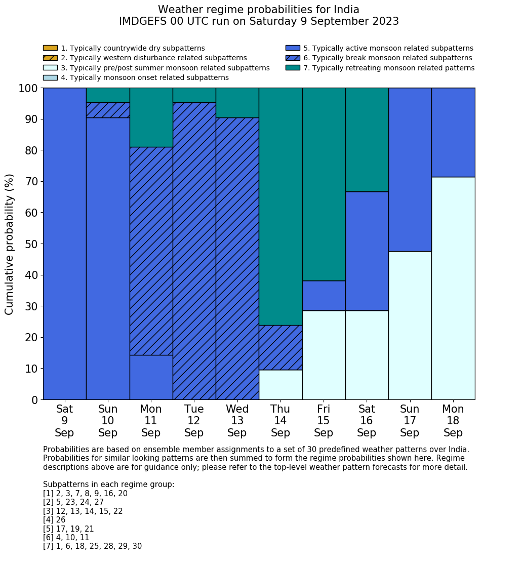 | Weather patterns typically associated with break monsoon tendencies over India are most likely Weather patterns 4, 10 and 11 (break) | |