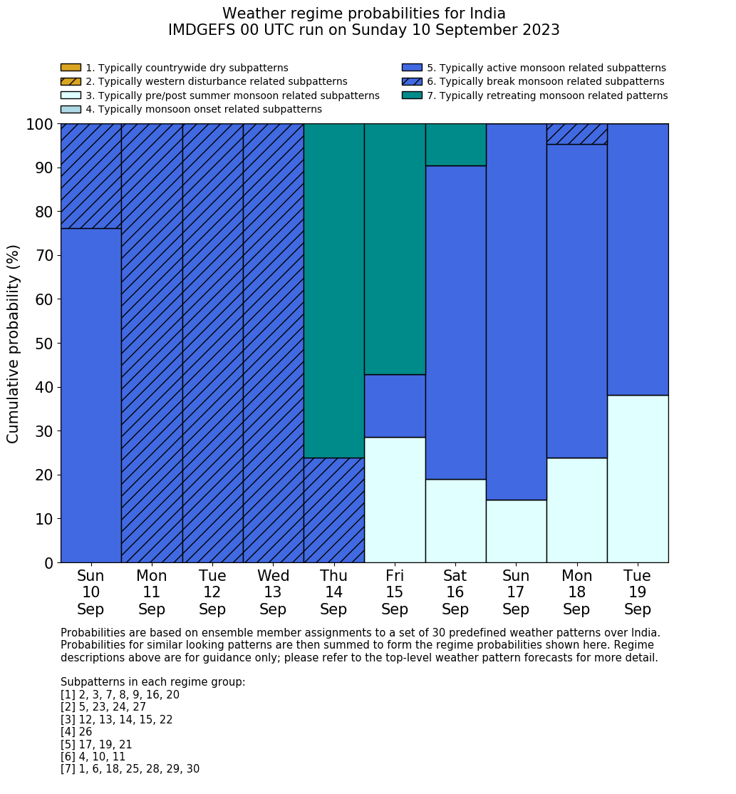 | Weather patterns typically associated with break monsoon tendencies over India are most likely Weather patterns 4, 10 and 11 (break) | |