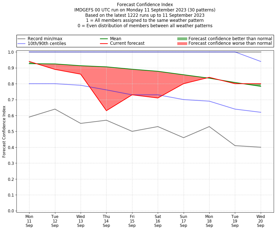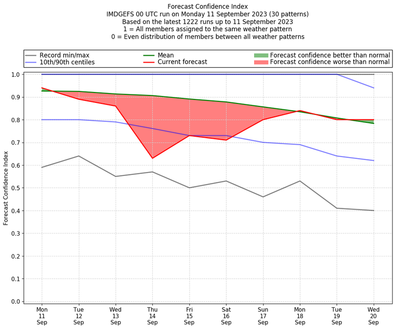 | Weather patterns typically associated with contrywide dry period tendencies over India are most likely Weather patterns 2, 3, 7, 8, 9, 16 and 20 (countrywide winter dry period) | |