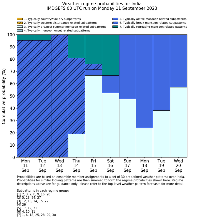 | Weather patterns typically associated with break monsoon tendencies over India are most likely Weather patterns 4, 10 and 11 (break) | |